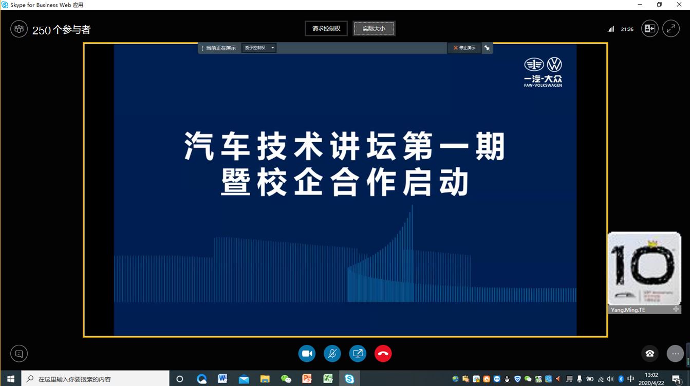 4月22日,世俱杯中国官网入口与一汽-大众汽车有限公司合作举办的汽车技术讲坛在线上开讲。汽车仿真与控制国家重点实验室曾小华教授进行了主题为《节能与新能源汽车技术进展》的讲座。一汽-大众有限公司技术研发部李丹总监、黄杰书记,世俱杯中国官网入口高振海院长、雷雨龙副院长参加线上启动仪式。一汽-大众有限公司技术研发部260名员工在线上参加讲座。