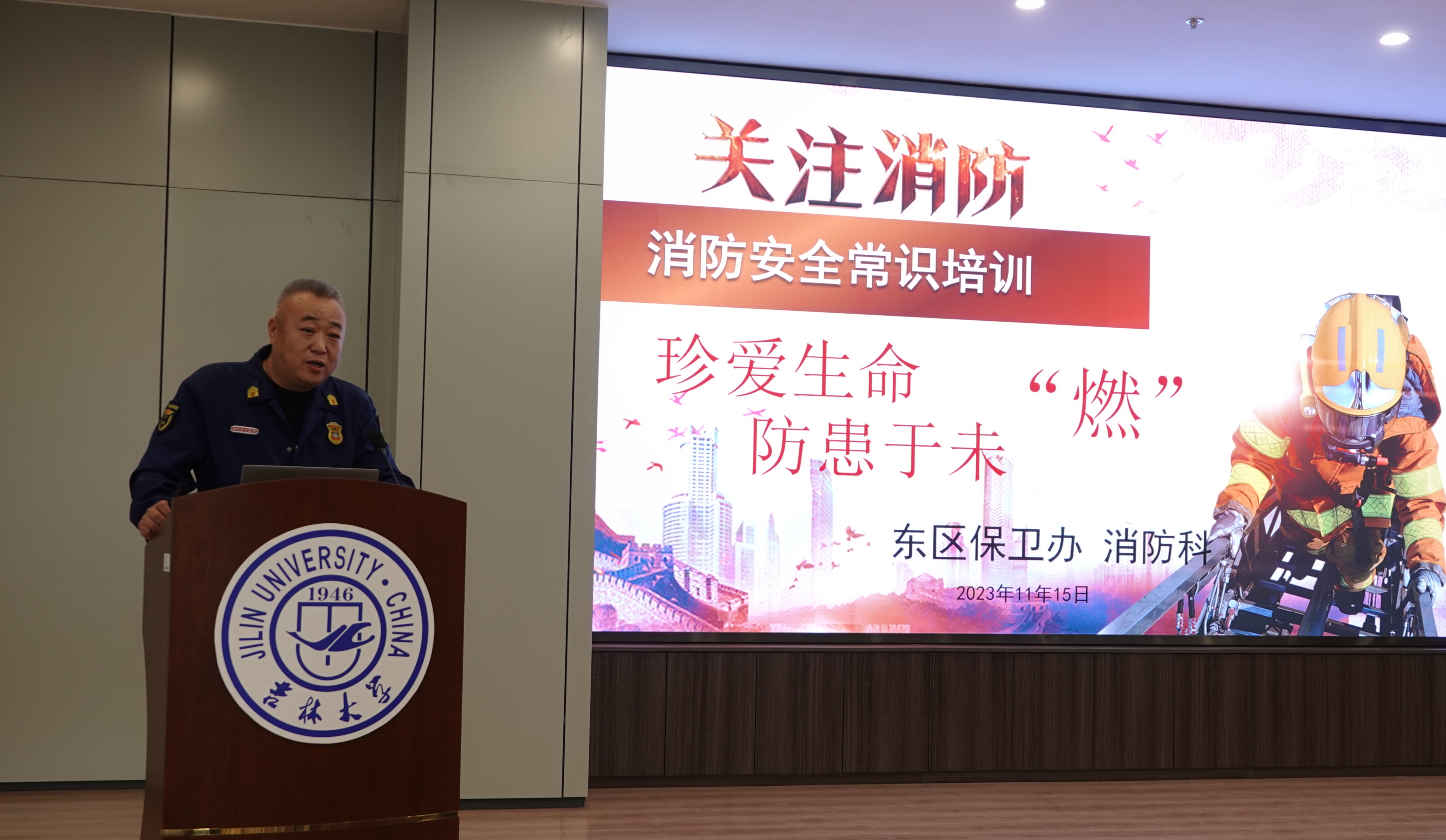 本次活动分为消防安全知识培训、应急防火疏散演练、消防器材灭火演练三个环节。首先,东区保卫办防火科科长王中刚根据学校消防工作管理办法,结合近年来全国各地学校发生的火灾案例,重点剖析了火灾事故根源,详细讲解了火灾预防、火灾应对措施及逃生方法等内容,强调“防”重于“消”,进一步加深了师生对火灾危害的认知,有效增强了师生的消防安全责任意识。