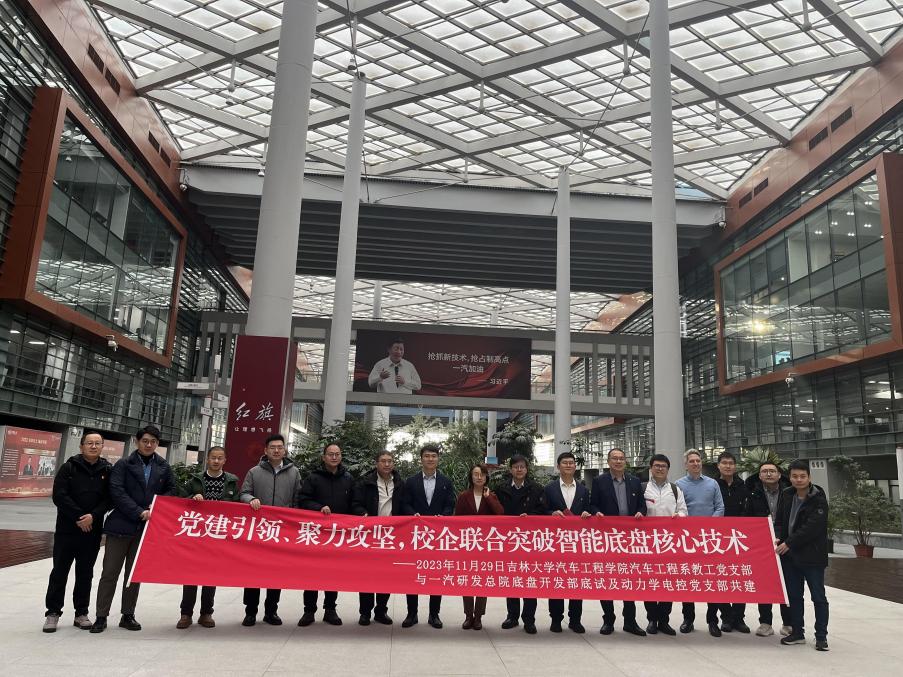 2023年11月29日,世俱杯中国官网入口汽车工程系教工党支部赴一汽研发总院底盘开发部底试及动力学电控党支部,以“党建引领、聚力攻坚、校企联合突破智能底盘核心技术”为主题开展支部共建活动。世俱杯中国官网入口党委书记黄忠华、副院长朱冰、汽车工程系教工党支部书记李建华等10余位党员与一汽研发总院底盘开发部首席设计师侯杰、部长禹真与底试及动力学电控党支部书记李论、组织委员王伟等10余位党员共同出席了活动。