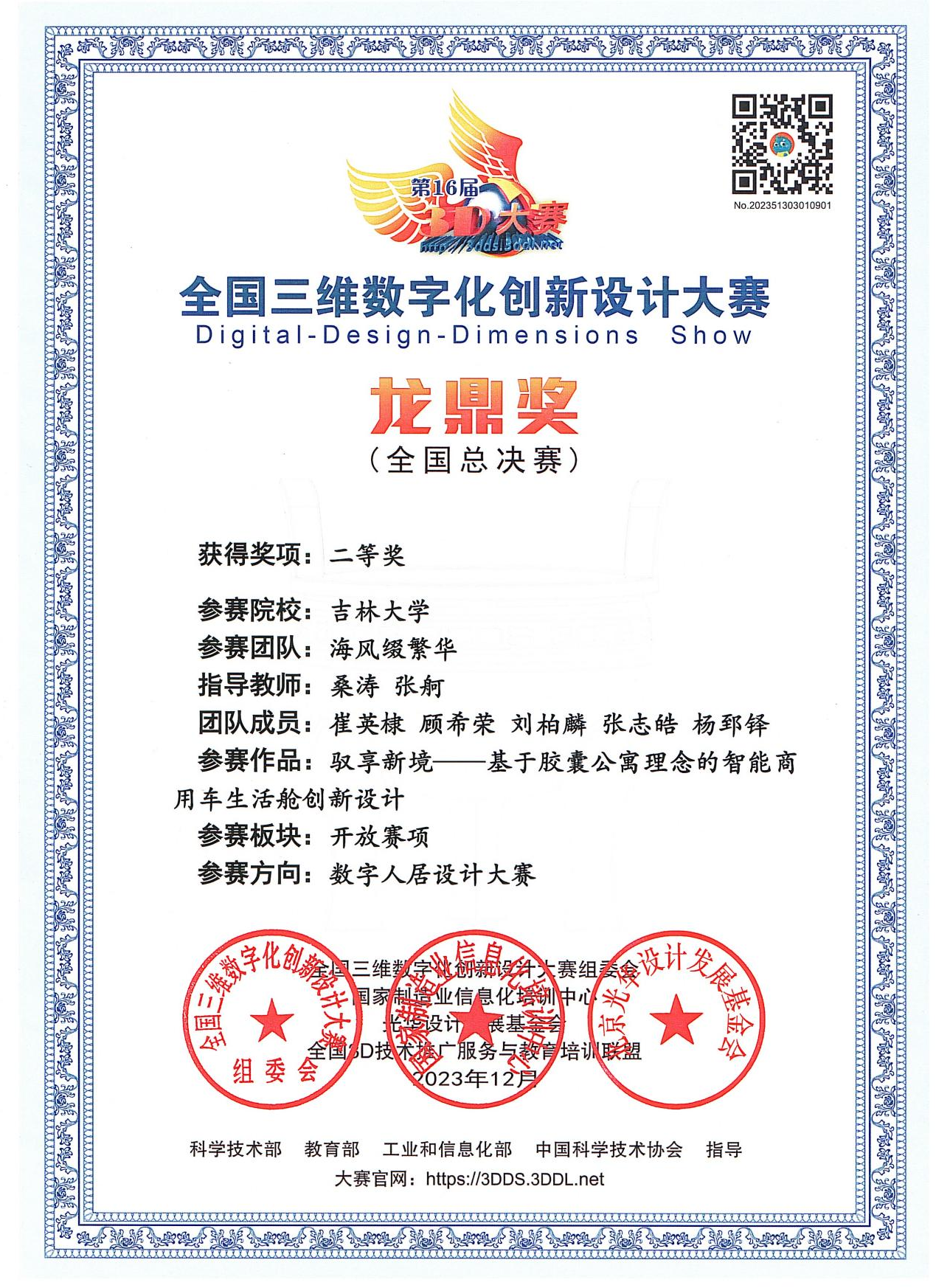 经过初赛和省赛的层层选拔,在指导老师和学生们的共同努力下,参赛队伍“海风缀繁华”的《驭享新境——基于胶囊公寓理念的智能商用车生活舱创新设计》作品荣获省级特等奖,顺利进入国赛,并在全国总决赛中荣获国家级二等奖。