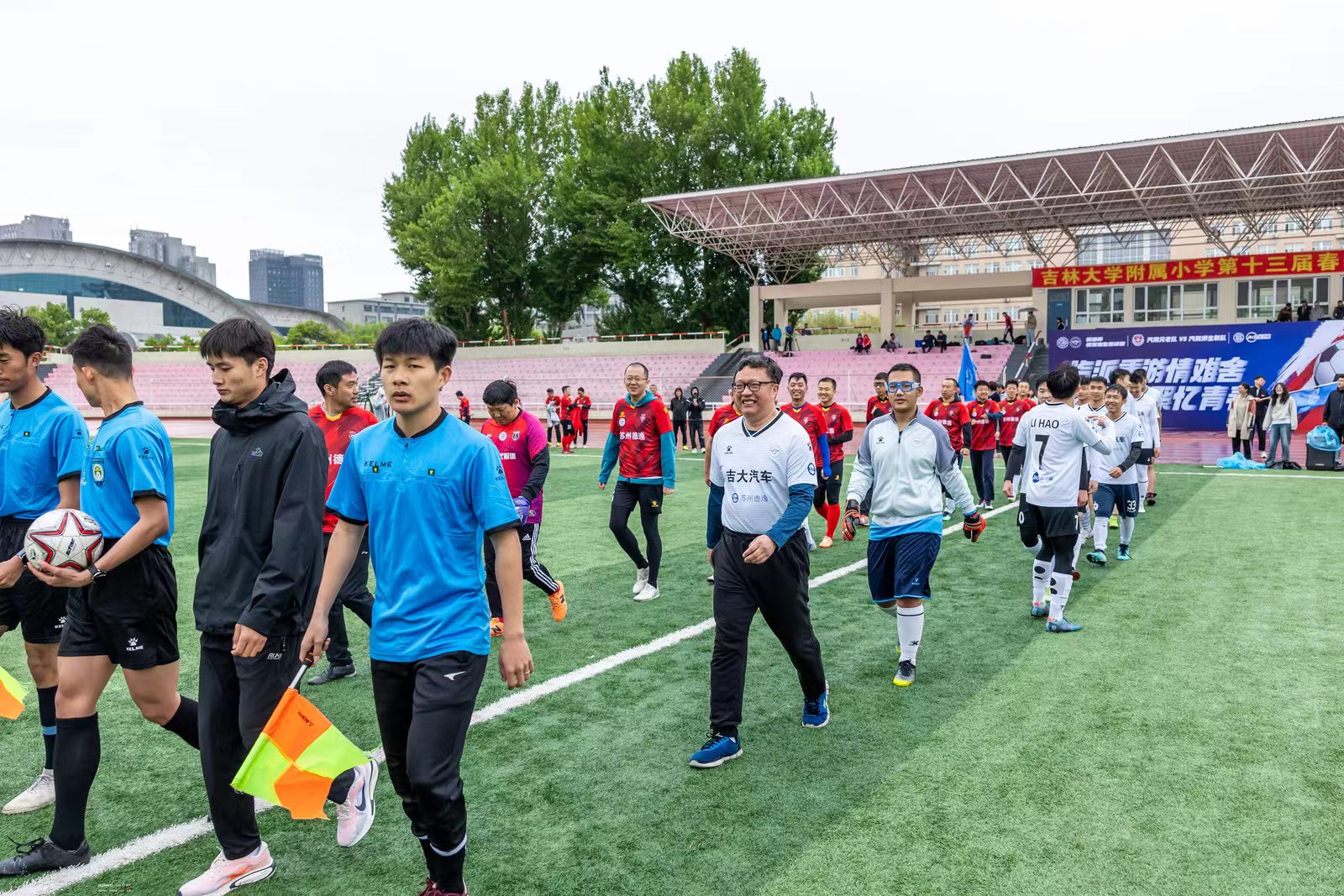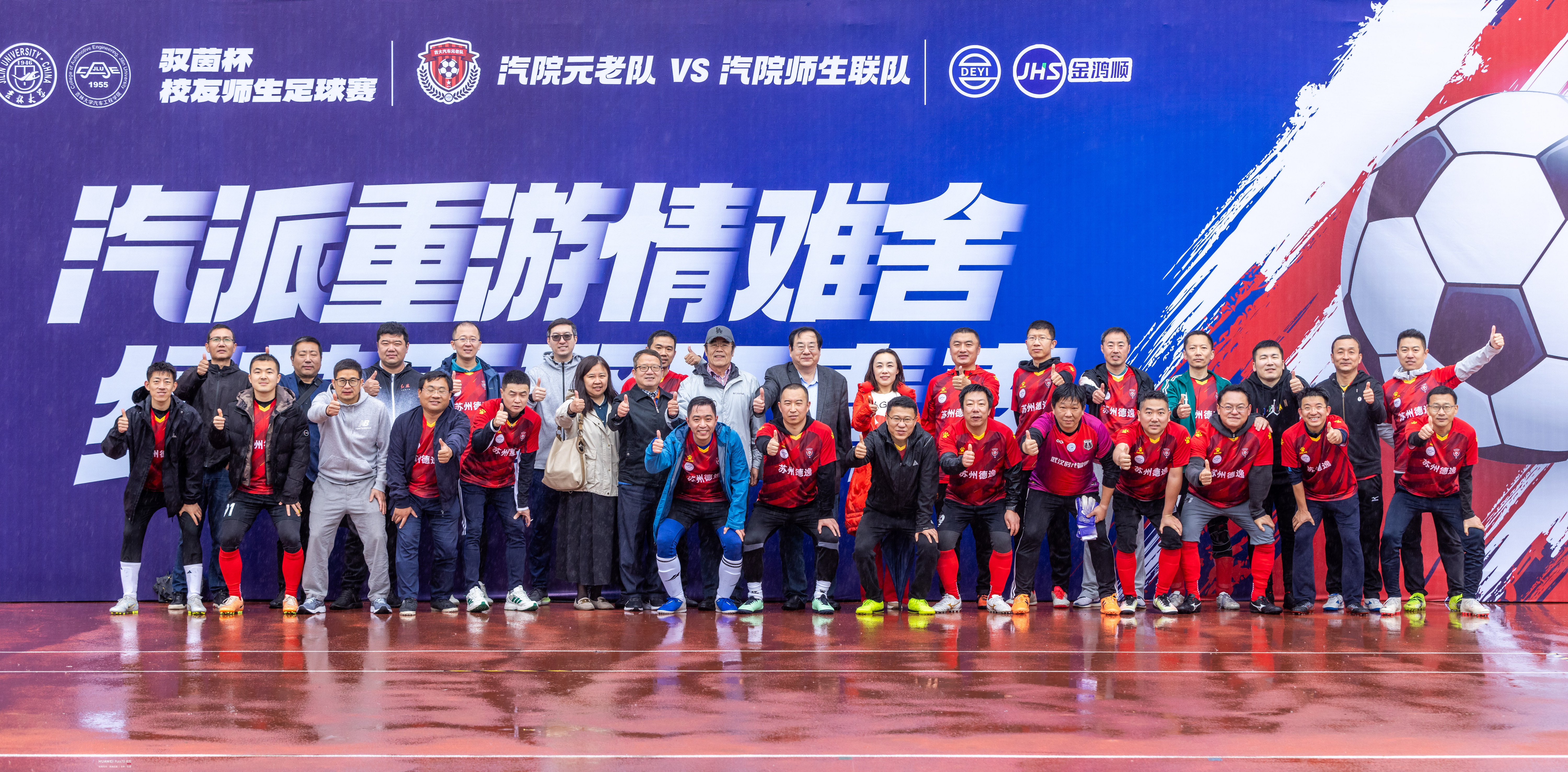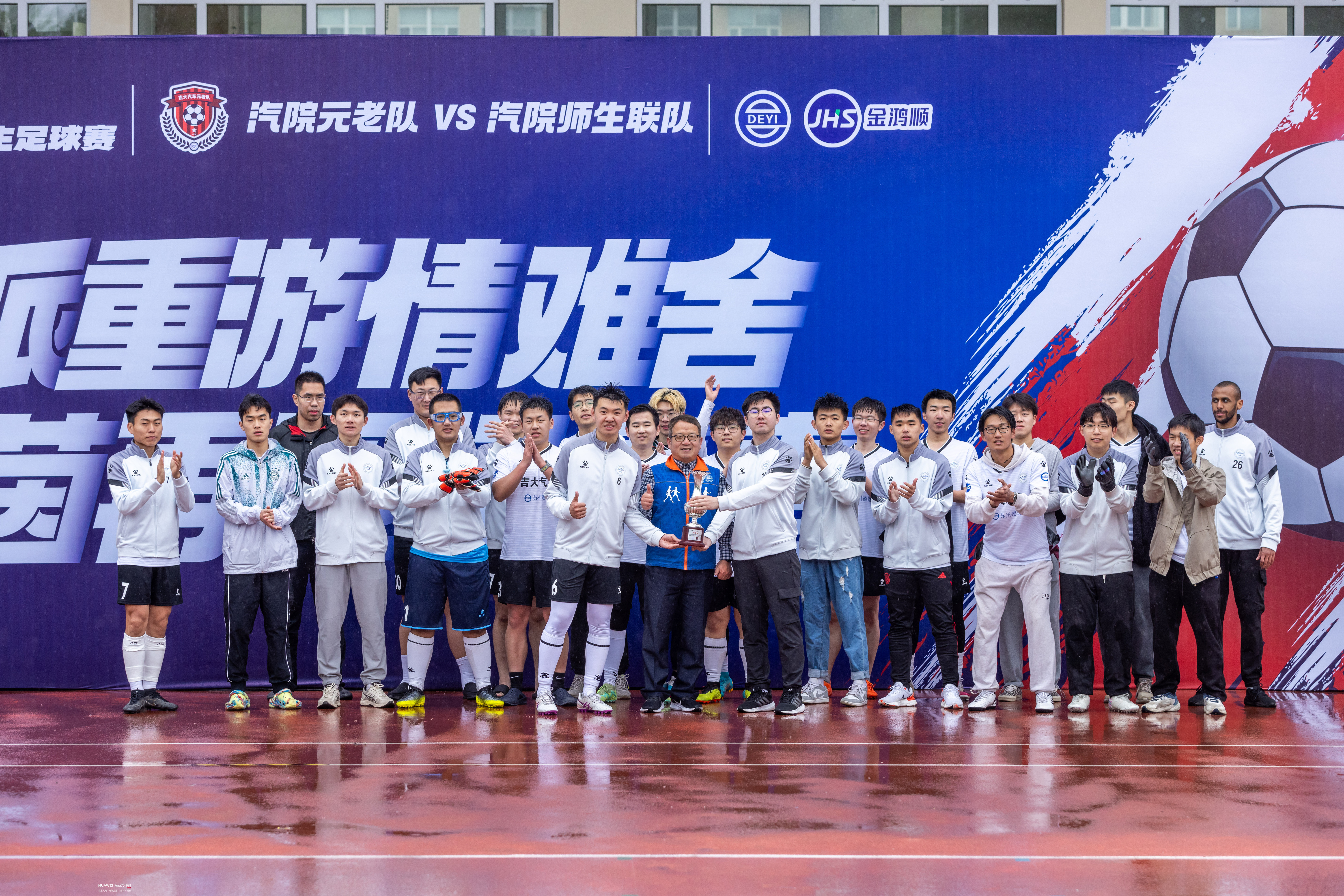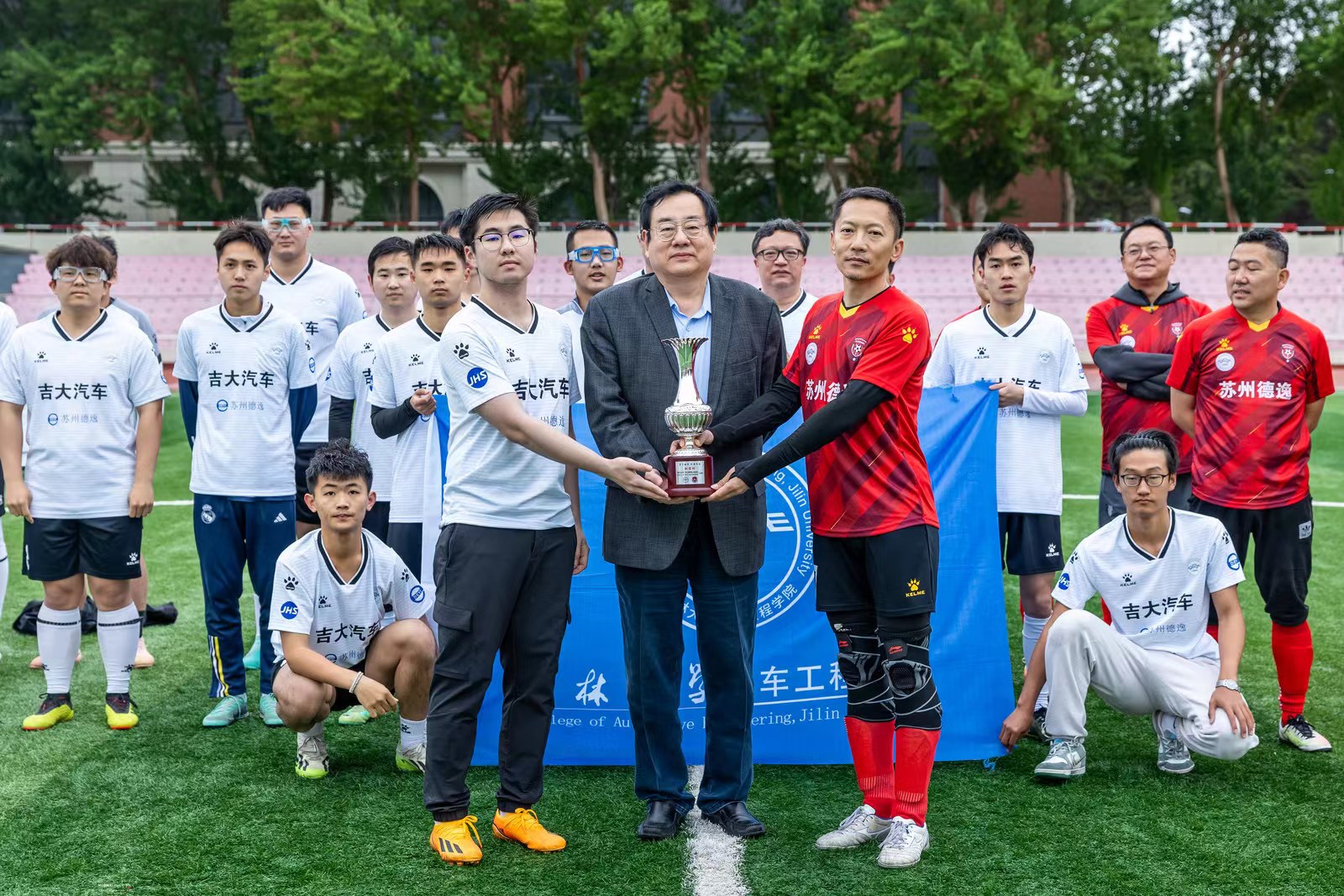 苏州德逸新能源汽车科技有限公司董事长、苏州金鸿顺汽车部件股份有限公司首席科学家林逸将凝结了汽院精神的“驭茵杯”奖杯授予双方球队队长,1996级校友、校友足球队队长杨佳音和师生足球队队长崔文骞共同接过奖杯,并合影留念。