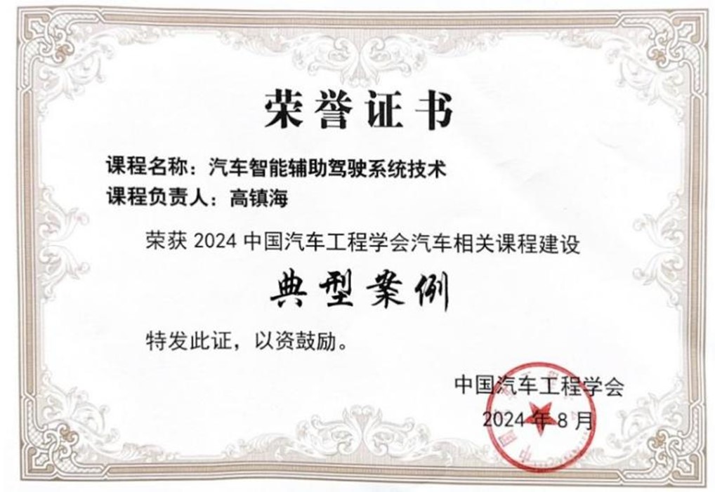 2024年8月,世俱杯中国官网入口高镇海教授、胡宏宇教授、孙天骏副教授联合开设的“汽车智能辅助驾驶系统技术”课程荣获2024中国汽车工程学会汽车相关课程建设典型案例奖。该奖项是由中国汽车工程学会于2023年首次设立,面向全国高等院校进行汽车相关课程建设案例征集,并将优秀典型案例在全国汽车行业人才培养院长论坛上进行现场展示。