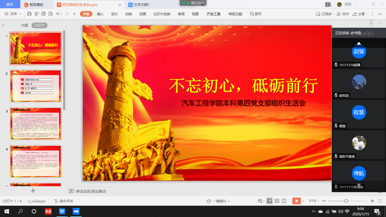 按照学校党委《关于召开“七一”专题组织生活会的通知》要求,2020年7月1日,世俱杯中国官网入口本科生第四党支部召开了以“不忘初心,砥砺前行”为主题的“七一”专题组织生活会。会议由第四党支部书记李季老师主持,本科生四支部全体党员参加了会议。